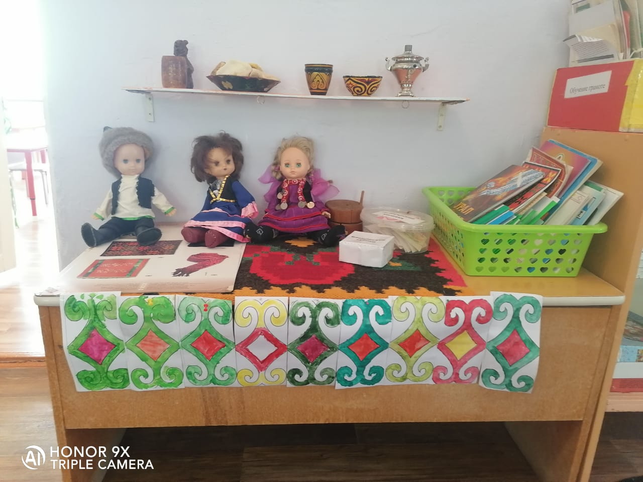 В детском саду прошли занятия, посвященные дню башкирского костюма. Дети с интересом просмотрели небольшой ролик о национальной одежде, с удовольствием примерили на себя национальные костюмы. Были проведены сюжетно-ролевые игры. В закреплении ребята составили и раскрасили орнамент, традиционный для башкирского народа.